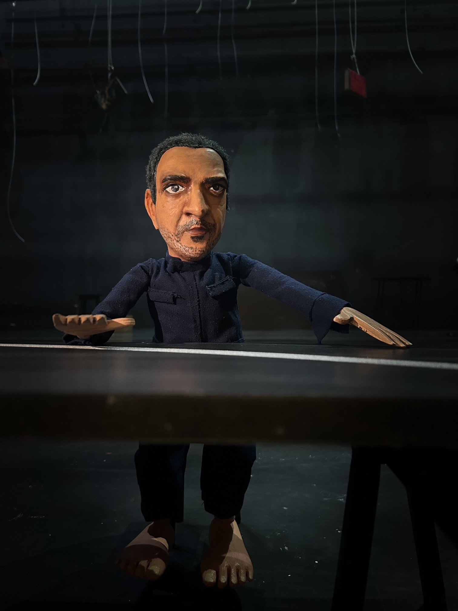 Ítalo Laureano – Os bonecos atuam principalmente como duplos dos atores, como nossos avatares e simulacros. Nesse sentido, aparecem como uma crítica ao nosso tempo contemporâneo, em que cada vez mais habitamos plataformas digitais que nos representam, nos conectam, mediam nossos afetos e desejos. Hoje em dia, criamos vários avatares com nossas imagens, muitas vezes editadas e idealizadas. Em Velocidade, nossos bonecos surgem em todas as cenas como desdobramentos/duplos desse sujeito e, ao final, na cena Queda Livre Talk Show, surgem numa espécie de duelo entre criador e criatura. Nesse embate, lançamos questionamentos sobre como estamos lidando com nossas subjetividades. Essa provocação nos remete às redes sociais, às inteligências artificiais e à virtualização das relações, não somente nesse universo tecnológico, mas às nossas escolhas durante a vida, nossas crenças, nossas vitórias, fracassos, enfim, a nossa histórica enquanto sujeito e sociedade.