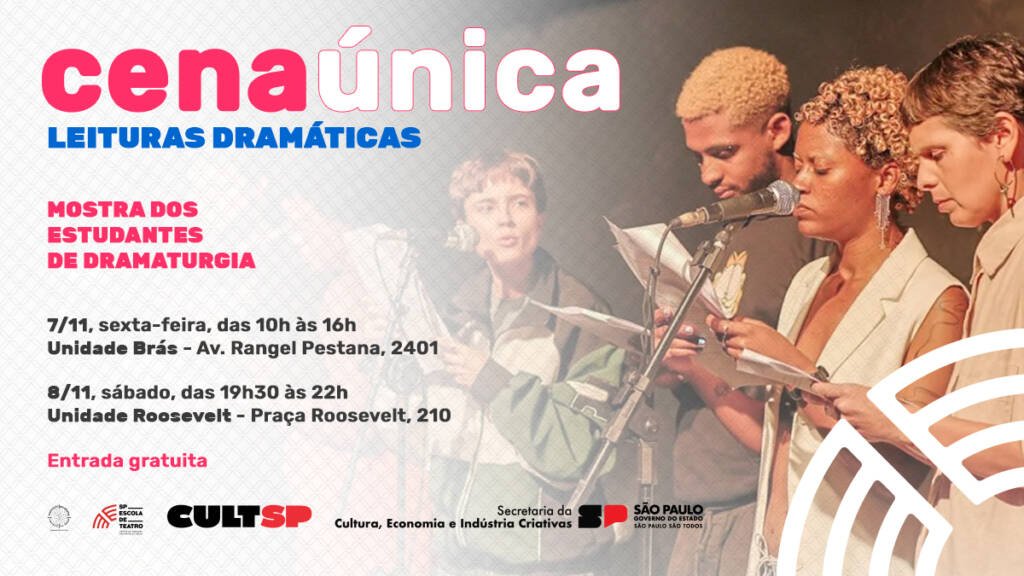 Acontece nos dias 7 e 8 de novembro, nas unidades Brás e Roosevelt da SP Escola de Teatro – Centro de Formação das Artes do Palco, o evento Cena Única – leituras dramáticas dos estudantes do curso de Dramaturgia.