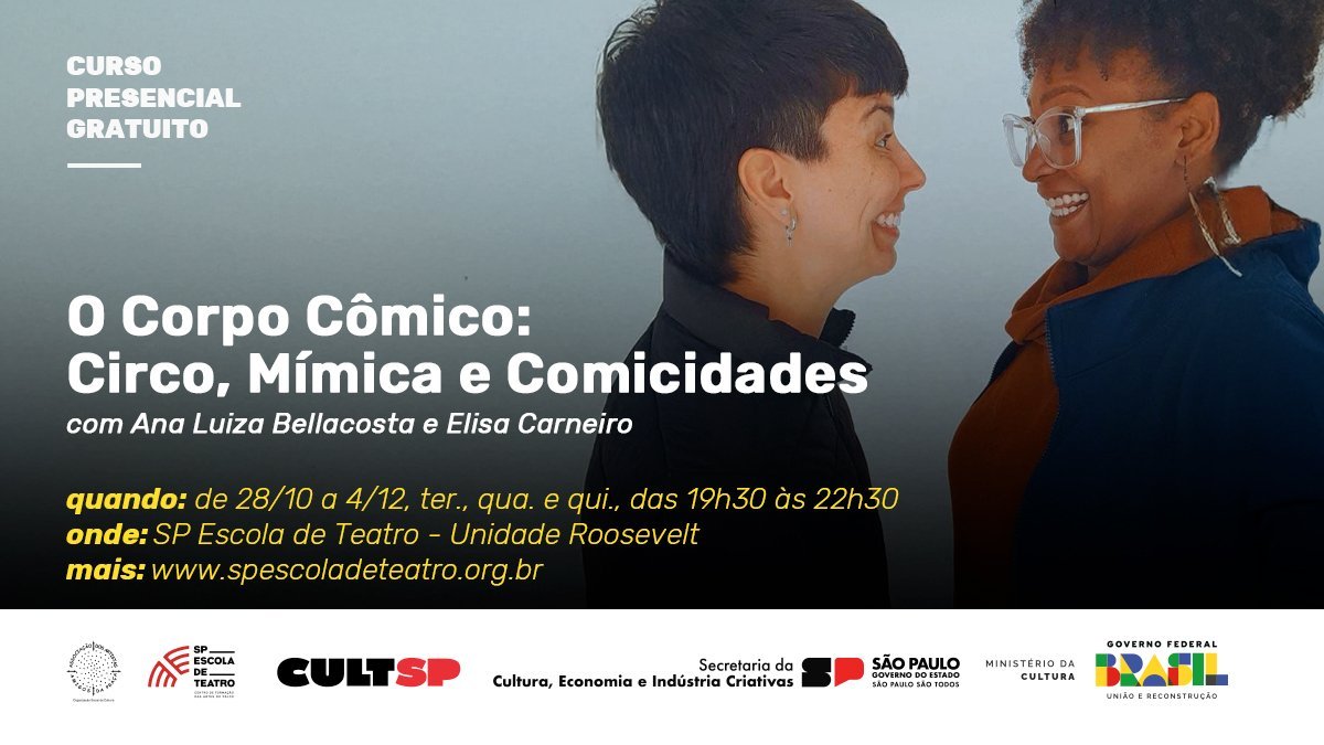 Estão abertas até 23 de outubro as inscrições para o curso de extensão gratuito “O Corpo Cômico: Circo, Mímica e Comicidades”, a ser ministrado pelas artistas Ana Luiza Bellacosta e Elisa Carneiro.