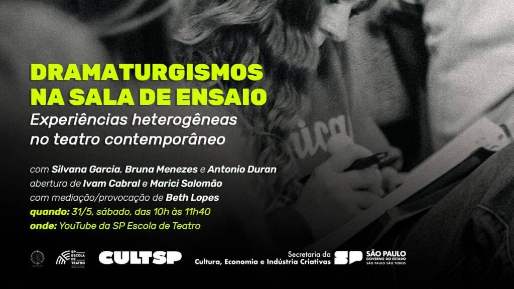 Em maio e junho acontece na SP Escola de Teatro – Centro de Formação das Artes do Palco o evento online “Dramaturgismos na Sala de Ensaio”, organizado por Marici Salomão, coordenadora do curso técnico de Dramaturgia da Escola, e Antonio Duran, dramaturgista, ator e diretor.