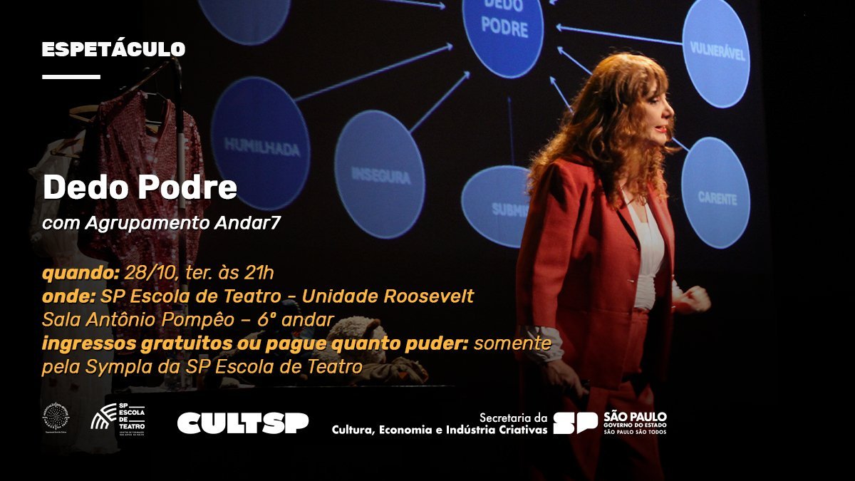 Acontece em 28 de outubro na unidade Roosevelt da SP Escola de Teatro – Centro de Formação das Artes do Palco o espetáculo “Dedo Podre”, peça do Agrupamento Andar7.