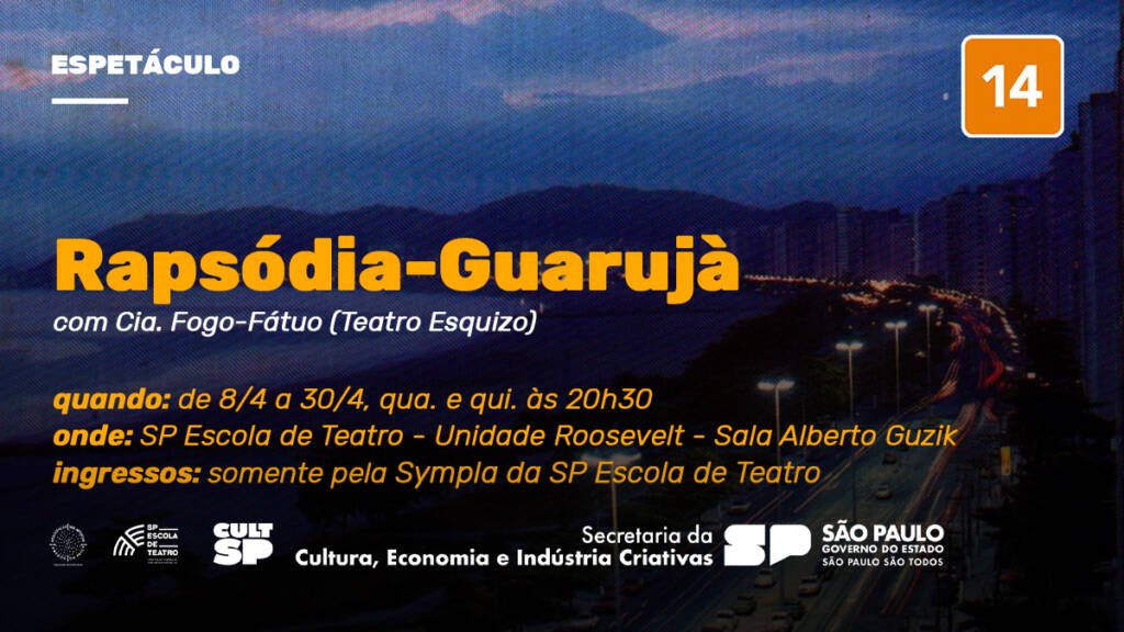 Fica em cartaz de 8 a 30 de abril na Sala Alberto Guzik da SP Escola de Teatro – Centro de Formação das Artes do Palco o espetáculo “Rapsódia-Guarujà”, com a Cia. Fogo-Fátuo (Teatro Esquizo).