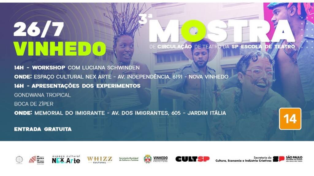 Dando prosseguimento à Mostra de Circulação dos estudantes da SP Escola de Teatro – Centro de Formação das Artes do Palco, instituição da Secretaria da Cultura, Economia e Indústria Criativas do Estado de São Paulo, agora é a vez do público de Vinhedo nos conhecer!