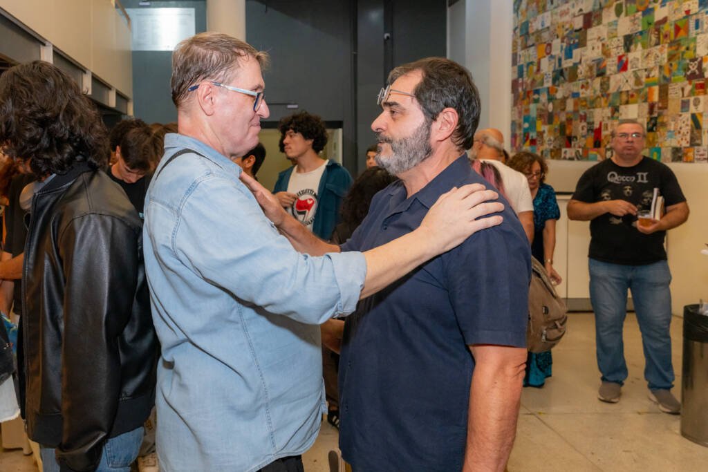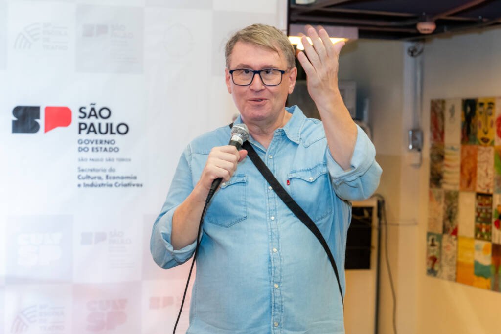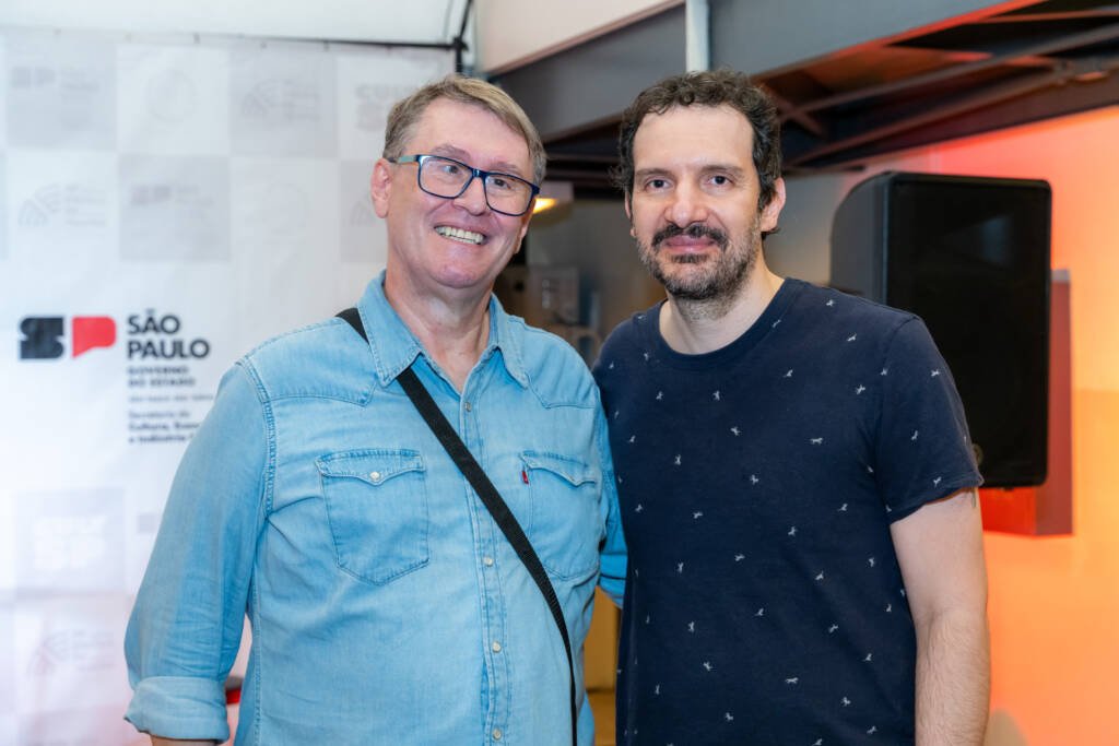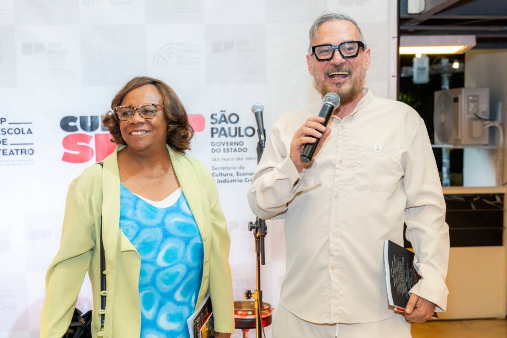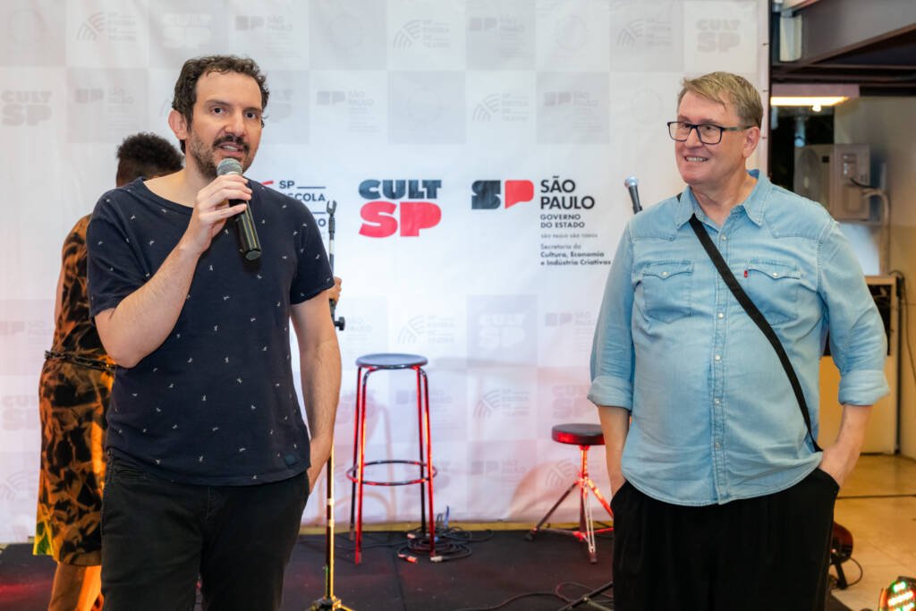 Martins falou ao público sobre o processo de concepção da revista ao lado de Marcio Aquiles, assessor de relações internacionais e parcerias da SP Escola de Teatro.