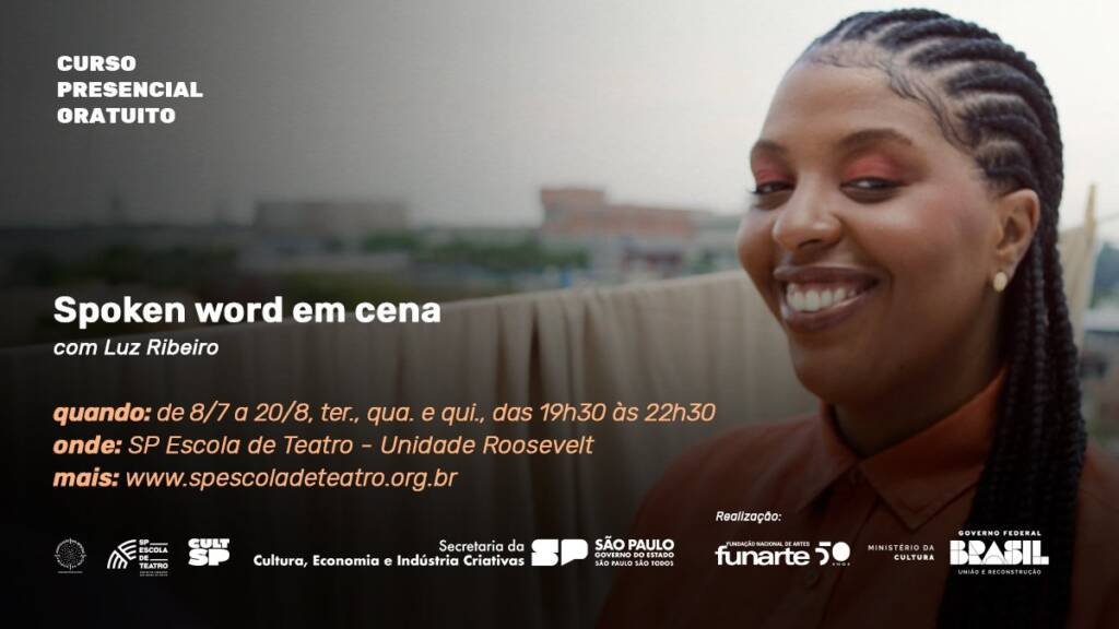 Estão abertas até 3 de julho as inscrições para o curso presencial e gratuito “Spoken word em cena”, ministrado por Luz Ribeiro e oferecido pela área de Extensão Cultural da SP Escola de Teatro – Centro de Formação das Artes do Palco.