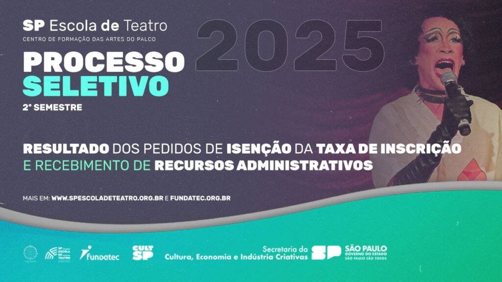 A SP Escola de Teatro – Centro de Formação das Artes do Palco e a Fundatec divulgaram nesta sexta-feira (4), conforme previsto em Edital, o resultado dos pedidos de isenção ou redução da taxa de inscrição no Processo Seletivo 2025/2º semestre para o Curso Técnico de Teatro.