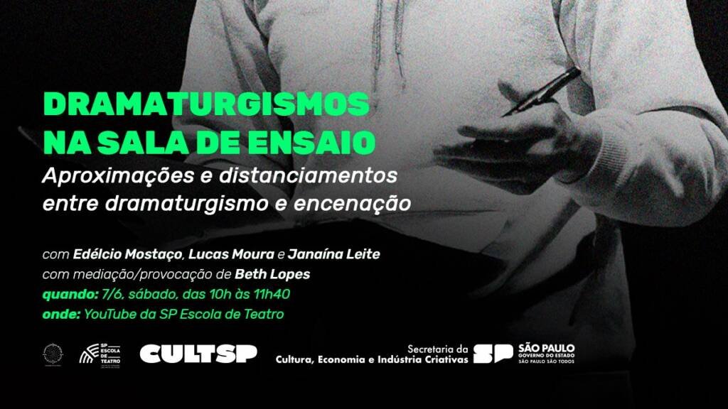 Acontece em 7 de junho (sábado) na SP Escola de Teatro – Centro de Formação das Artes do Palco a segunda mesa do evento online “Dramaturgismos na Sala de Ensaio”, organizado por Marici Salomão, coordenadora do curso técnico de Dramaturgia da Escola, e Antonio Duran, dramaturgista, ator e diretor.