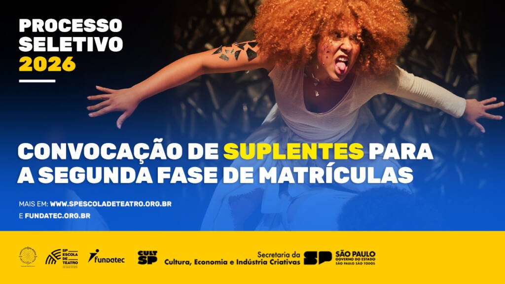 SP Escola de Teatro – Centro de Formação das Artes do Palco, instituição da Secretaria da Cultura, Economia e Indústria Criativas do Estado de São Paulo, e a Fundatec divulgaram hoje (8) a lista de suplentes convocados para matrícula no processo seletivo 2026/1º semestre.
