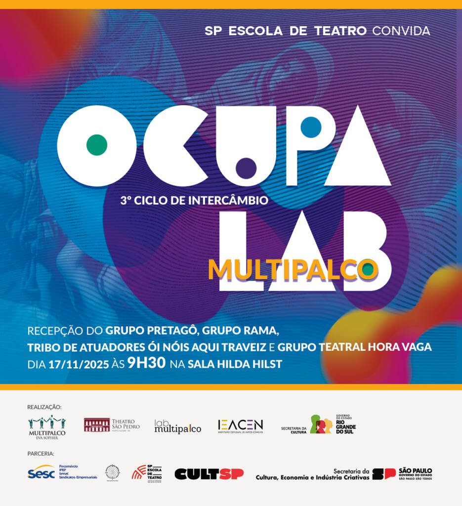 Em mais um ciclo do projeto Ocupa Lab Multipalco, a SP Escola de Teatro – Centro de Formação das Artes do Palco, instituição da Secretaria da Cultura, Economia e Indústria Criativas do Estado de São Paulo, recebe nessa semana quatro coletivos gaúchos de teatro para atividades formativas, intercâmbios artístico-pedagógicos e residências artísticas: Grupo Pretagô, Grupo RAMA, Tribo de Atuadores Ói Nóis Aqui Traveiz e Grupo Teatral Hora Vaga.