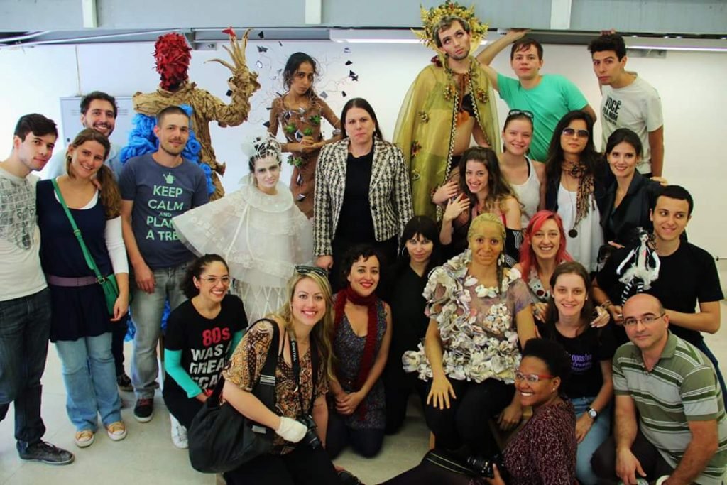 Iza sentada, bem abaixo, em comemoração com a turma de Cenografia e Figurino