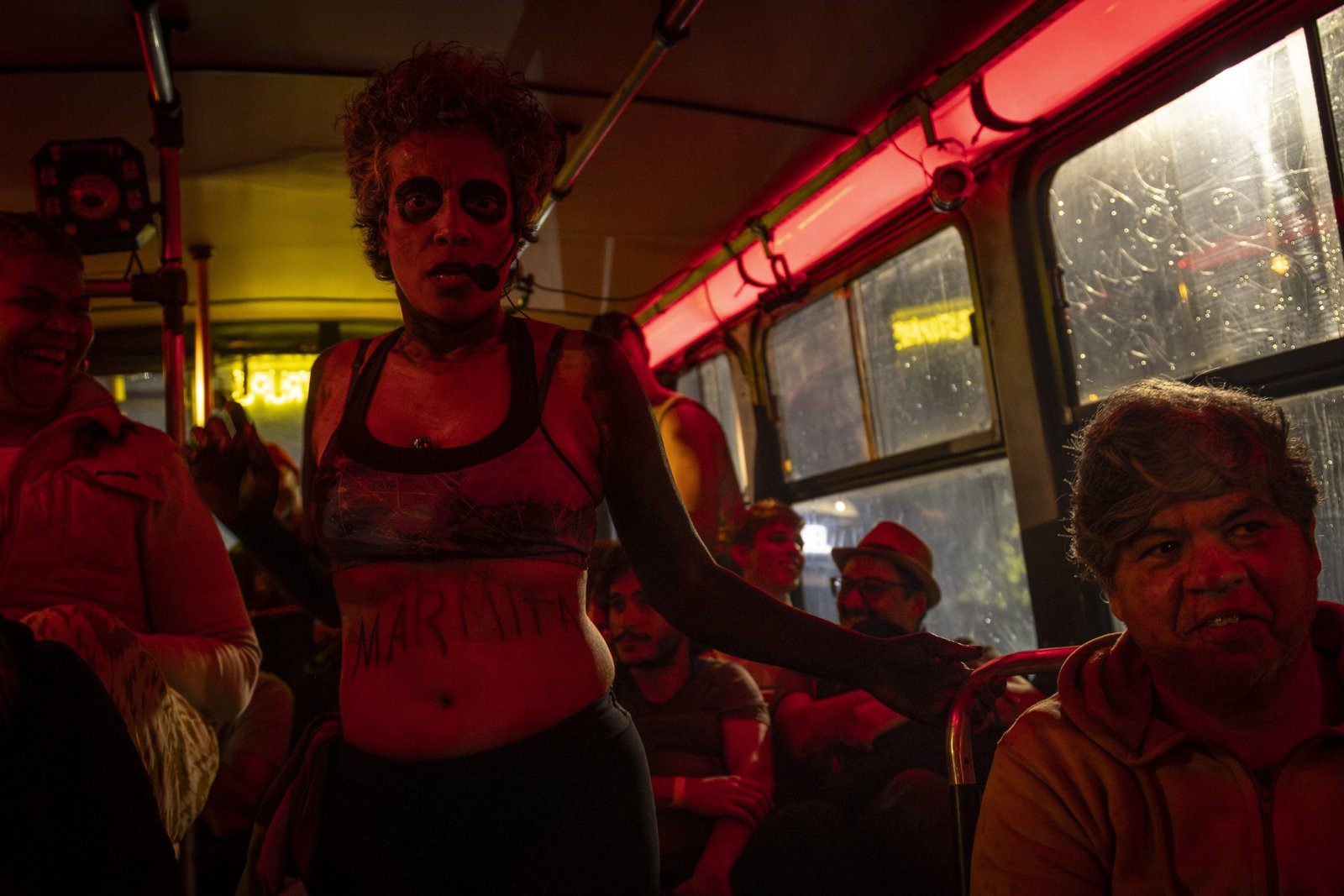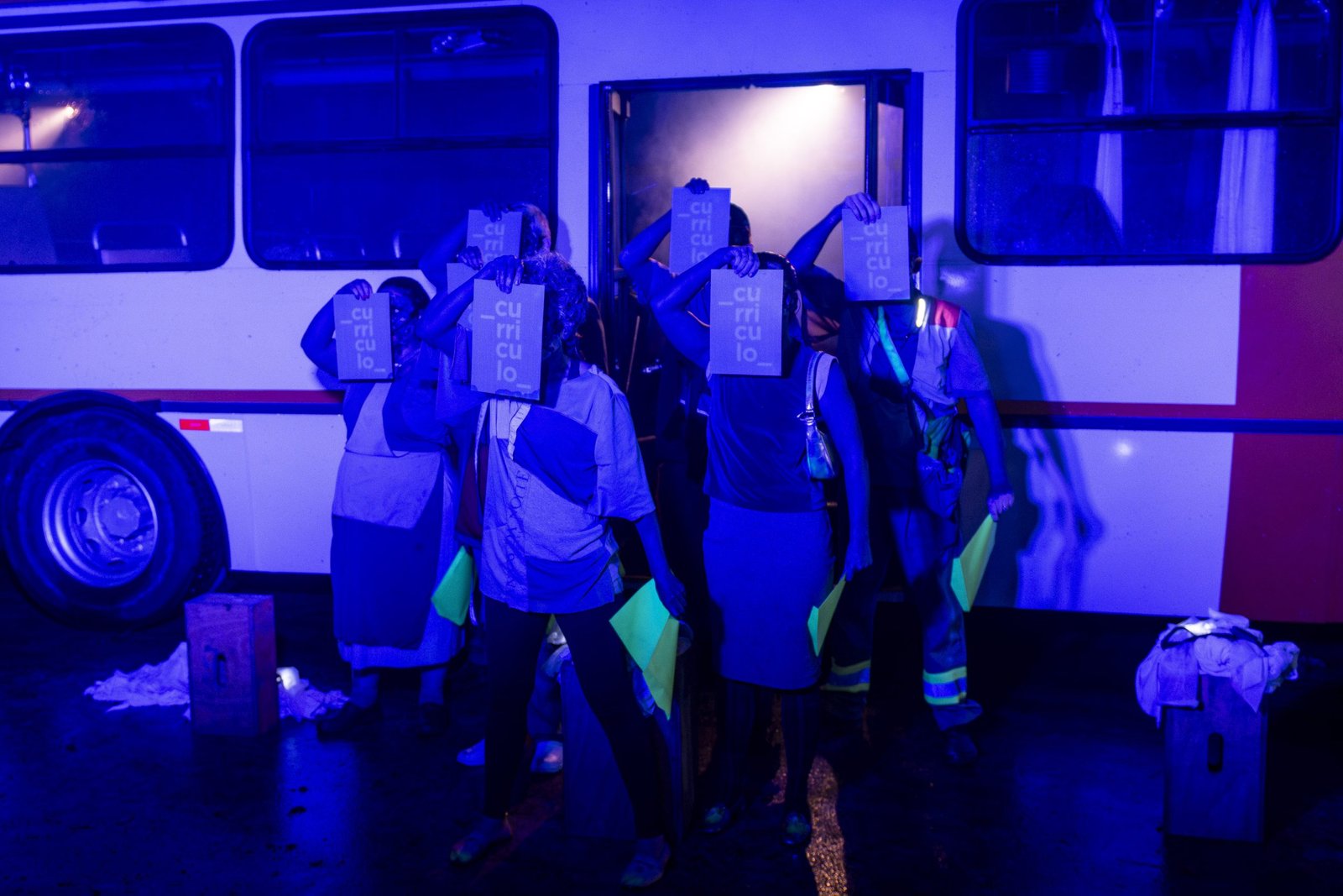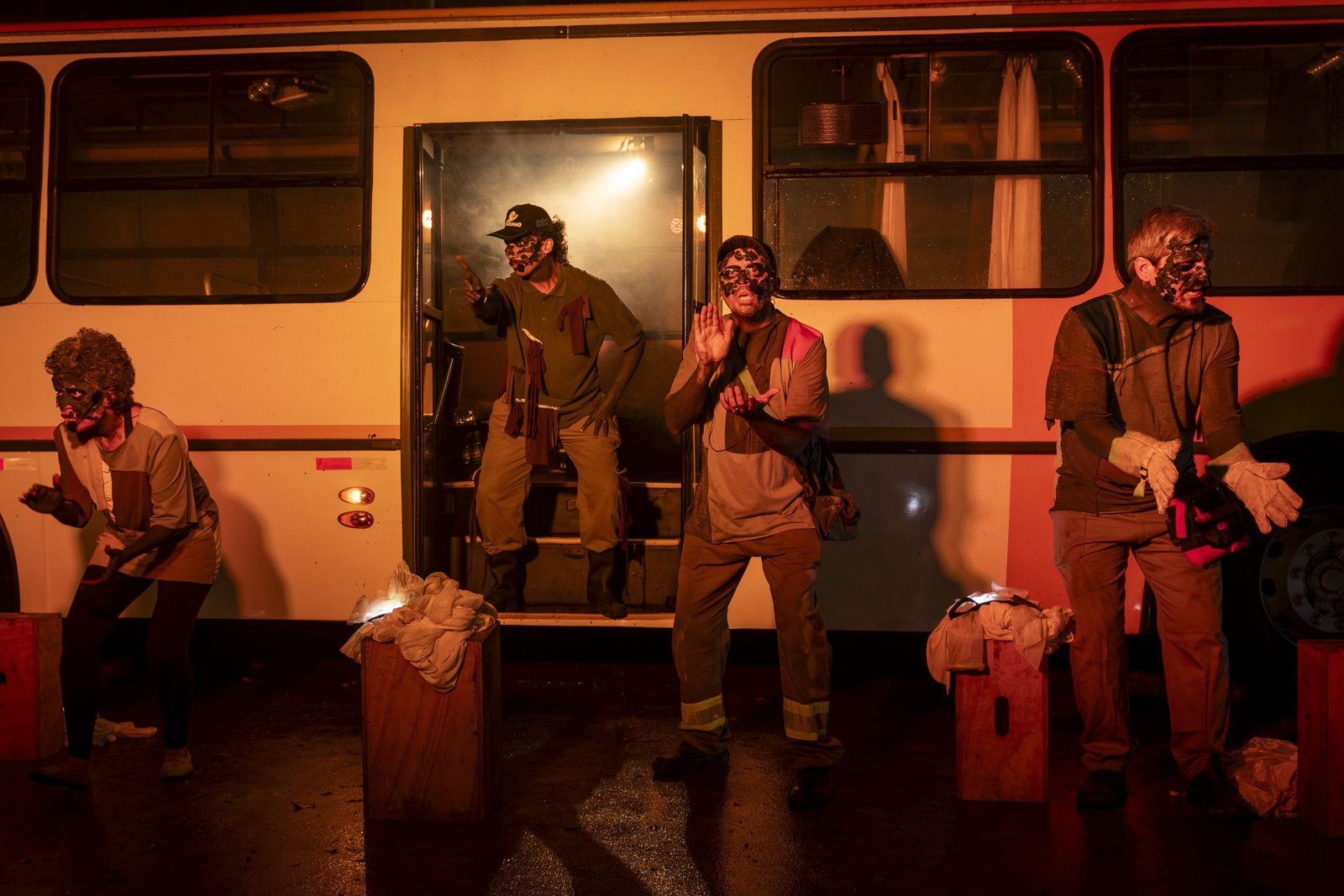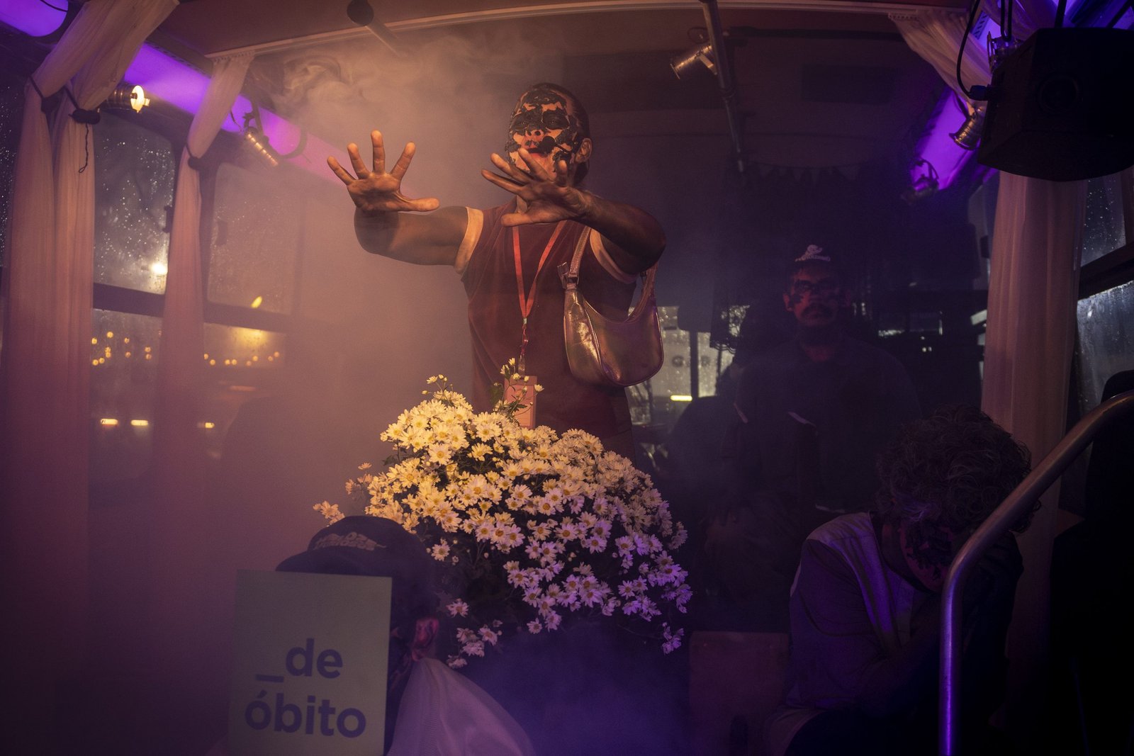 Durante a pandemia, o ônibus não parou e seguiu seu itinerário. Em suas lotações, cada vez mais ausências. O luto não-vivido divide espaço com a indignação. O espetáculo ocorre dentro de um ônibus, num tempo suspenso, um manifesto operístico-multimídia sobre morte, vida e movimento.