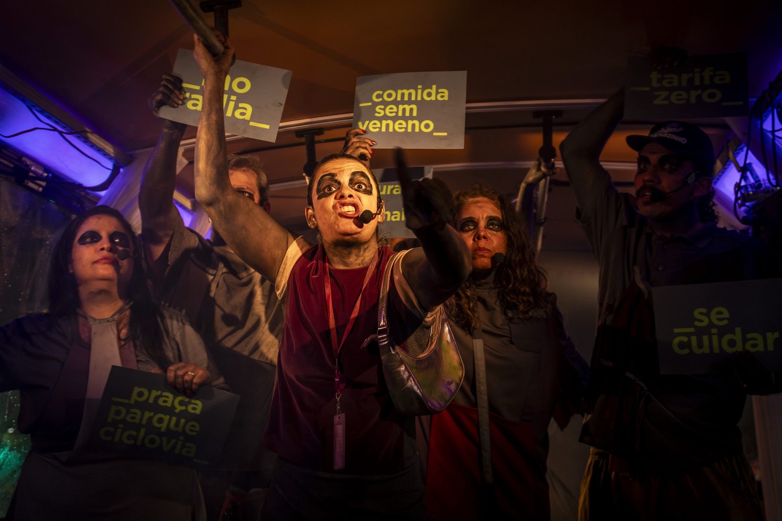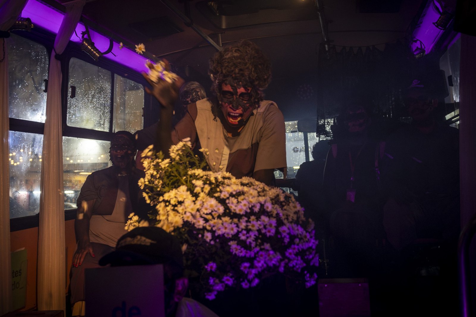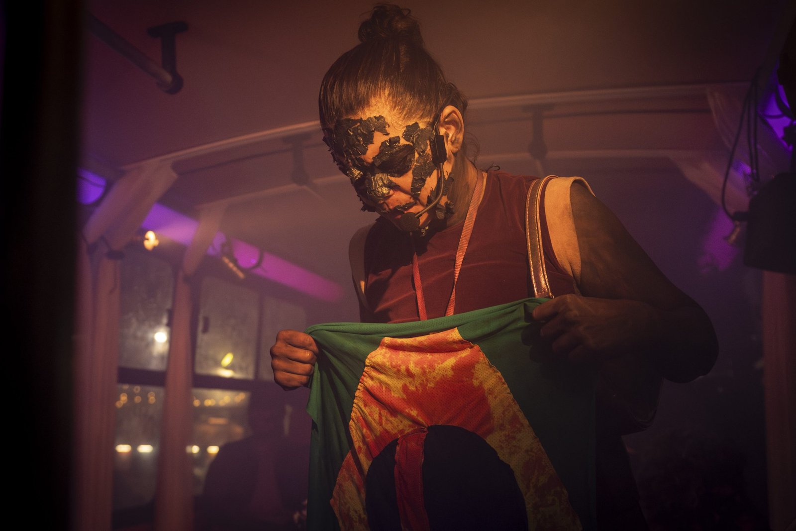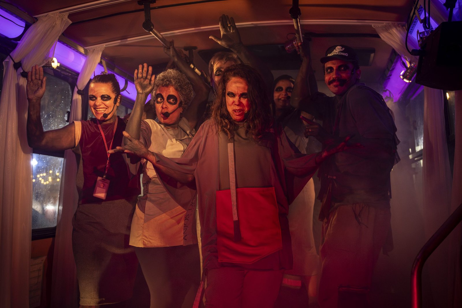 Durante a pandemia, o ônibus não parou e seguiu seu itinerário. Em suas lotações, cada vez mais ausências. O luto não-vivido divide espaço com a indignação. O espetáculo ocorre dentro de um ônibus, num tempo suspenso, um manifesto operístico-multimídia sobre morte, vida e movimento.
