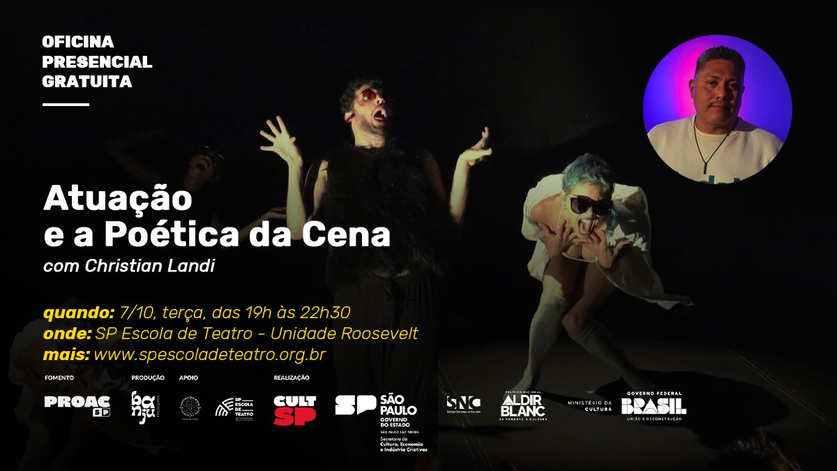 Estão abertas as inscrições para a oficina gratuita “Atuação e a Poética da Cena”, a ser ministrada por Christian Landi.