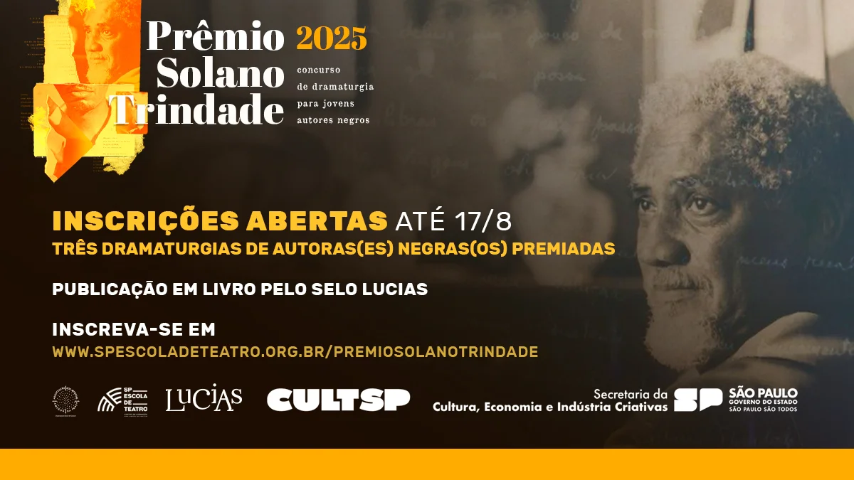 Estão abertas até 17 de agosto de 2025 as inscrições para a 6ª edição do Prêmio Solano Trindade, promovido pela SP Escola de Teatro – Centro de Formação das Artes do Palco, instituição da Secretaria da Cultura, Economia e Indústria Criativas do Estado de São Paulo e criada e gerida pela Associação dos Artistas Amigos da Praça (ADAAP).